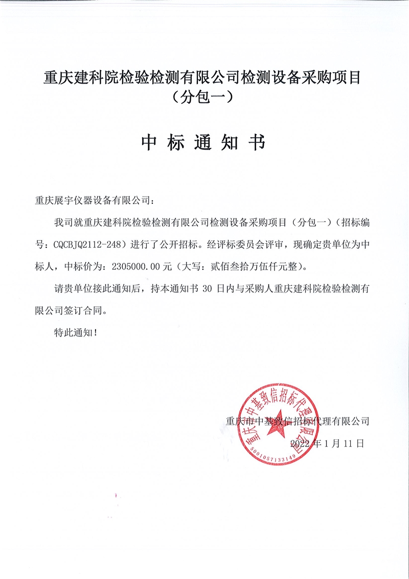 重慶建科院檢驗檢測有限公司委托重慶市中基致信招標代理有限公司對我公司檢測設備采購項目(項目號:CQCBJQ2112-248 )分包一(力學)和分包二(化學)進行了公開招標采購,現已完成全部采購程序。確認重慶展宇儀器設備有限公司為分包一(力學)中標人,中標價為2305000元(貳佰參拾萬伍仟佰元整)。確認重慶典鼎科技有限公司為分包二(化學)中標人,中標價為1828000元(壹佰捌拾貳萬捌仟元整)。