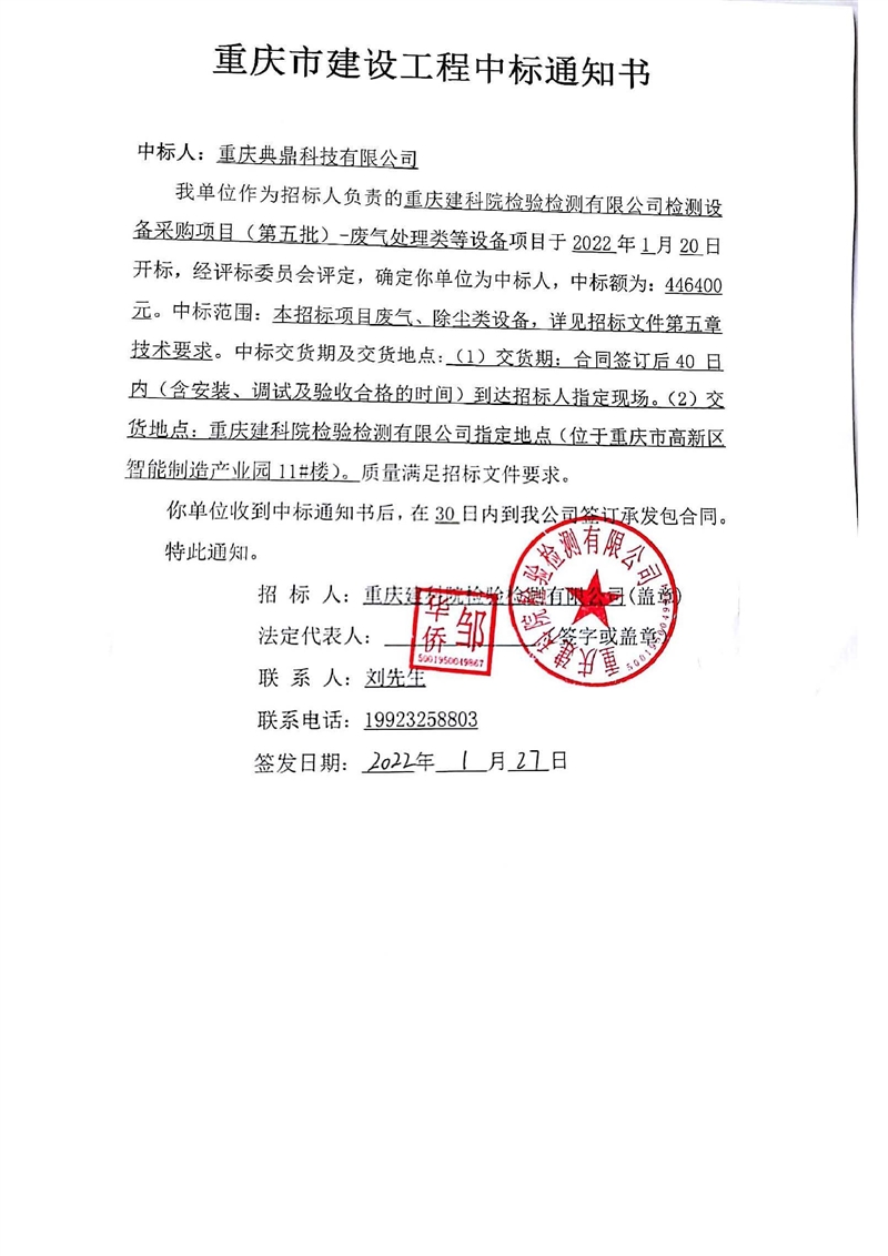 重慶建科院檢驗(yàn)檢測(cè)有限公司委托重慶市工程管理有限公司對(duì)我公司檢測(cè)設(shè)備采購(gòu)項(xiàng)目(項(xiàng)目號(hào):CQEM-ZB-22002 )重慶建科院檢驗(yàn)檢測(cè)有限公司檢測(cè)設(shè)備采購(gòu)項(xiàng)目(第五批)-廢氣處理類(lèi)等設(shè)備進(jìn)行了公開(kāi)招標(biāo)采購(gòu),現(xiàn)已完成全部采購(gòu)程序。確認(rèn)重慶典鼎科技有限公司為檢測(cè)設(shè)備采購(gòu)項(xiàng)目(第五批)-廢氣處理類(lèi)等設(shè)備采購(gòu)項(xiàng)目中標(biāo)人,中標(biāo)價(jià)為446400元(大寫(xiě):肆拾肆萬(wàn)陸仟肆佰元整)。