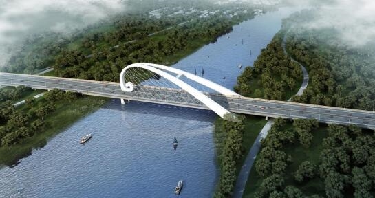 香河縣安石路(運河大道-冀京界段)建設工程是《北京市通州區與河北省三河、大廠、香河三縣市協同發展規劃》的重點工程,也是北運河廊坊段旅游通航的重要組成部分路線全長3.624公里,采用一級公路兼城市主干路標準建設,道路標準橫斷面采用四幅路形式,雙向六條機動車道,外設非機動車道和人行道,路基寬47米。其中橋梁段(即王家擺大橋)1060.1米(主橋長256米,引橋長804.1米)采用抱翅型拱梁組合體系,由“Λ”字抱翅外形的空間異形主拱拱圈、拱圈內與主梁連接的斜吊桿和主梁三大主體結構組合而成,主梁半幅為整體鋼箱,半幅之間用橫梁連接,拉索錨固在抱翅拱和主梁的橫梁上,橋面板采用正交異性鋼橋面板。抱翅拱的一端在中央隔離帶處與主梁橫梁連接,下接中墩支座;抱翅拱的另一端成“Λ”形分布于主梁兩側,通過橫梁與主梁連接。造型創意以如意型浪花為構思元素,將運河之水奔流涌動之態和如意的古典華美抽象融合,建成后將成為當地一座極富美感的景觀橋。