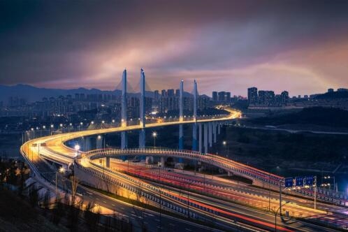 蔡家嘉陵江大橋項目位于渝武高速馬鞍石大橋、軌道六號線嘉陵江大橋之間,北起北碚區蔡家,南接兩江新區禮嘉。是城市南北向主干道的重要組成部分。主橋為雙塔雙索面斜拉橋,全長約1442米,主橋全長為 600米(跨徑布置為140+320+140米),斜拉橋下塔柱最高達110米,上塔柱高度最高達115米。立柱擎天、飛架南北,湖藍水紋韻律,優雅與氣勢并存,與自然有機融合,為重慶新晉的攝影打卡地。