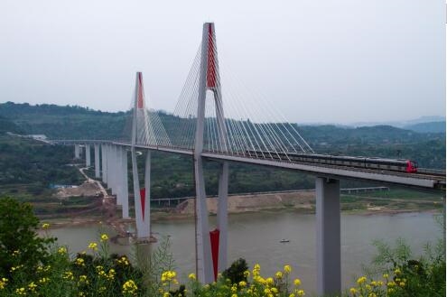 蔡家嘉陵江軌道專用橋為雙線軌道雙索面斜拉橋,全長1250米,由南北引橋和主橋組成,橋跨為連續梁、雙索面斜拉橋、連續鋼構引橋組成,其中主橋長640米、主跨250米、主橋面距河床距離100米。在設計時兼顧了功能性、景觀性以及可實施性,最終選擇了與環境協調,經濟實惠、施工可實施性強的斜拉橋,由于橋墩高、橋面窄,主橋寬度相對于普通的跨江公路大橋更窄,橋身顯得纖細,在云霧中呈現婀娜多姿的柔美姿態。