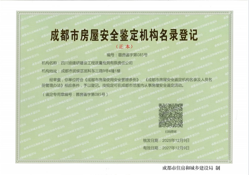 資質+1!四川渝建研公司順利通過成都市房屋安全鑒定機構資格審查